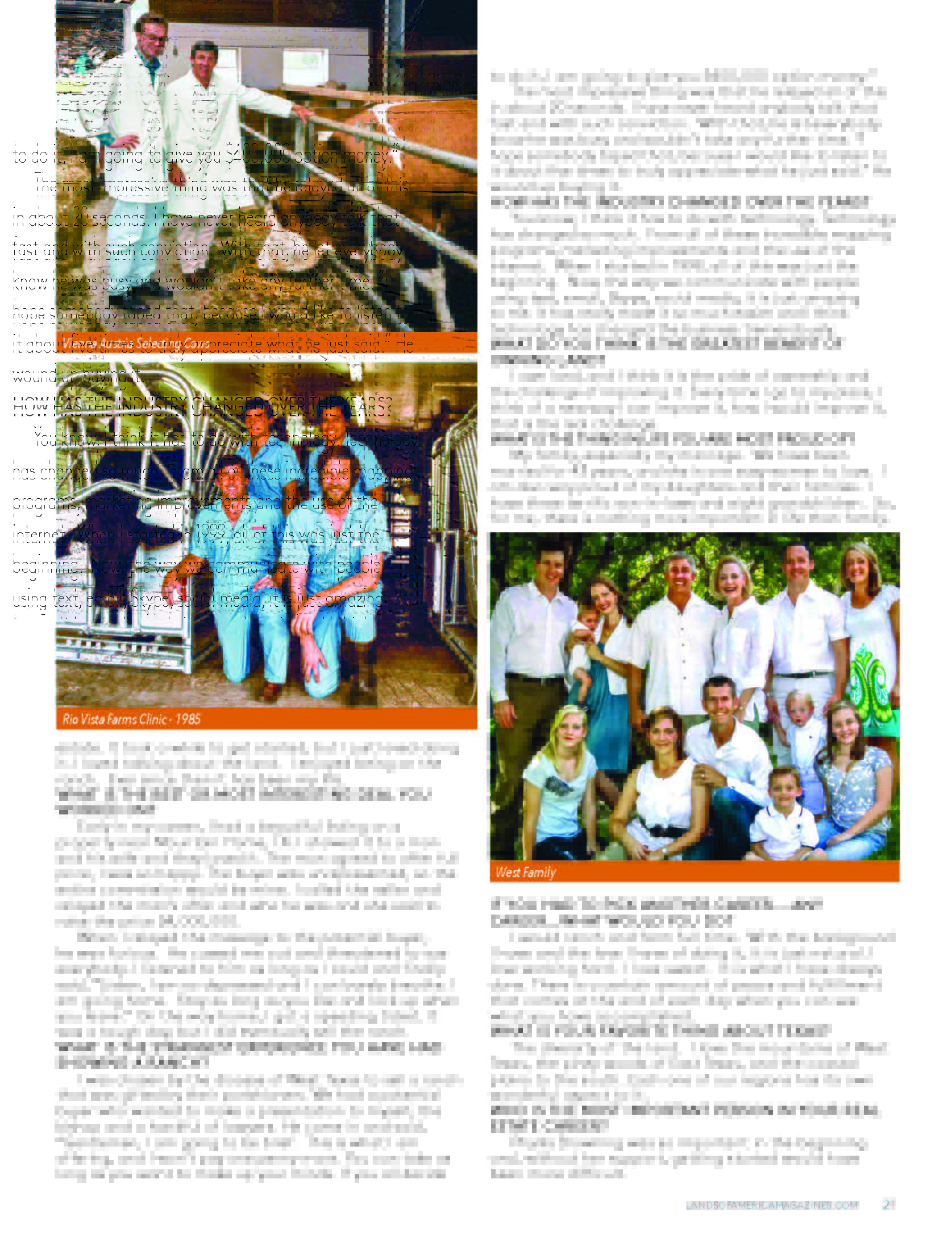 I have five brothers. We all worked together at the farm and we all worked hard. Eventually, my brothers left the farm and went in their own direction. They all have been very successful. My family has a proud heritage in the cattle business. My father, Albert West, was a visionary in cattle reproduction/reproductive science. He was instrumental in bringing Simmental cattle to the United States, and was elected president of the American Simmental Association in 1980. Dolph Briscoe, called my great great uncle, George West, “The most influential cattleman in the history of the state of Texas. My mother’s grandfather was W.B. Mitchell and established the Highland Hereford Association. He was not only acknowledged as an excellent cattleman, but also a wonderful man. I may never achieve what these men accomplished in their lives, but their example influences the way that I conduct myself in business. I would never do anything to tarnish their name or mine.